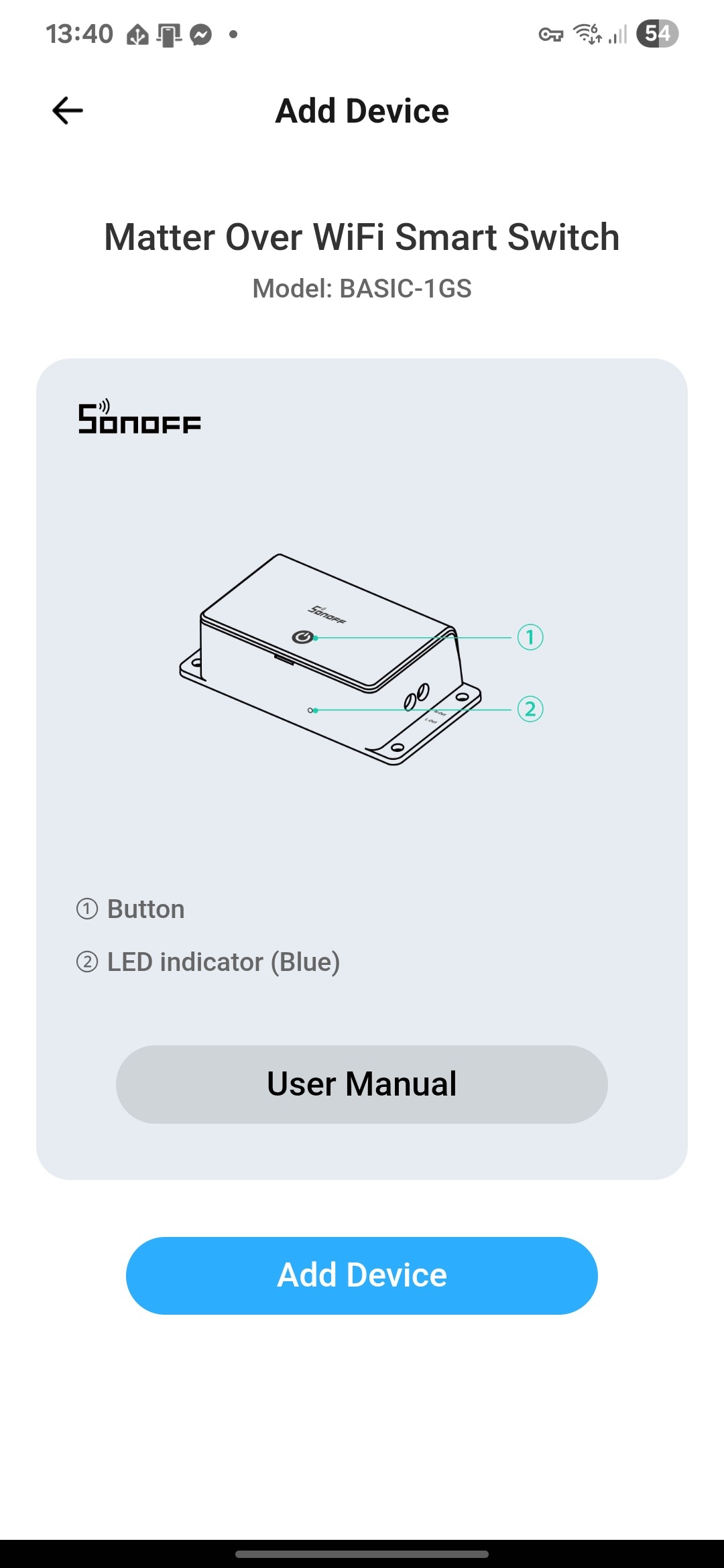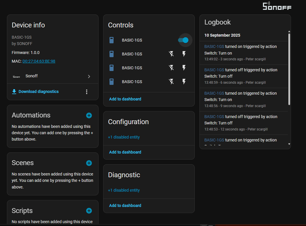 The upshot is I used the provided metal disk to open the top which normally just presses down – and remove the top… inside the old familiar PCB button… indeed it all looks VERY familiar inside from original model. I have an early version so it’s perhaps not surprising that Matter integration via Google Home didn’t work however I added the device in my Home Assistant eWeLink integration (+) easily.