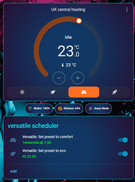 For the boiler and kitchen entities (Tasmota WiFi relay and Sonoff Zigbee temperature sensor) I had to enable the RSSI and LQI entities accordingly in the device settings in HA. Not necessary but handy to keep an eye on – especially the Zigbee battery powered device. No automations in this version of the thermostat, it’s all in the dashboard. Here are the three dashboard sections… AWAY mode is just FROST mode but made to look more obvious – see it turned ON below… This looks and works great.. Selecting eco, comfort or boost modes in the main STAT turns frost back off.