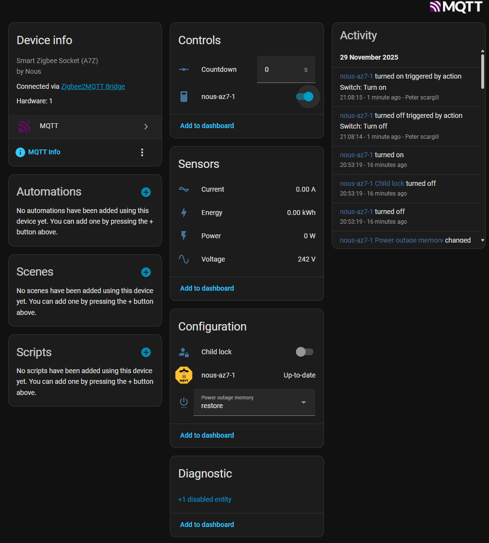 Anyway, I plugged it in to the mains. There was a blue light on the button, not flashing, so just instinctively I held the button in for several seconds. The blue light on the button started flashing on and off. I went to my ZigBee2MQTT panel and added the unit in, and that was it. Fully supported by Zigbee2MQTT (and of course by Nous’s own app if you’re that way inclined).
