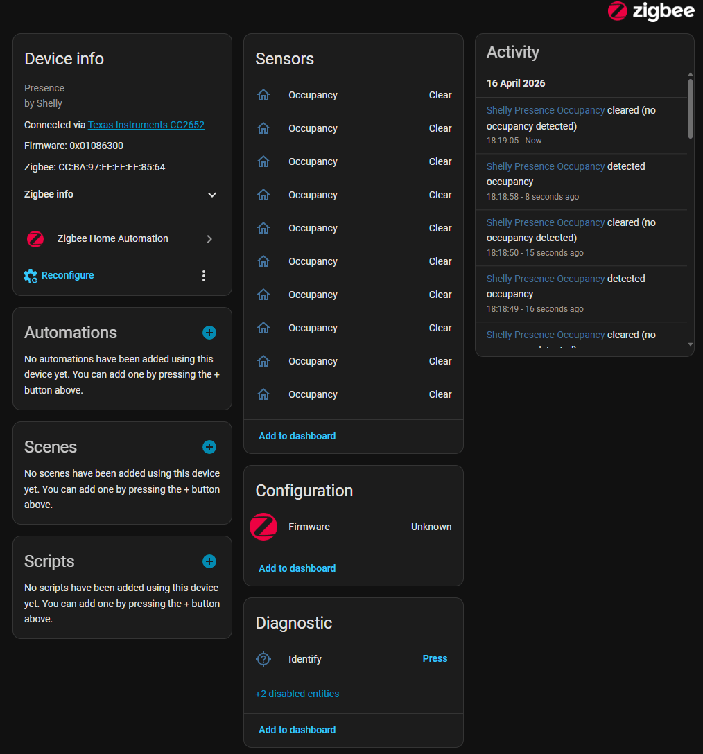 After setting up Shelly presence in Zigbee – adding it to the Shelly app (just for the sake of it) was the easiest install I’ve ever done – I simply hit + in the app and the app asked me if I wanted to attach it to my normal access point – didn’t even ask for the password for that. It then asked me which picture I wanted to use and where the location would be (i.e. my office) and that was it. It was installed within seconds. I noted Shelly Presence Gen4, twilight one zone and no objects so clearly this is a multi-zone sensor. Just not fully integrated into Zigbee yet.