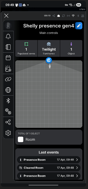 Hah, this is the stuff I’ve only seen in Home Assistant integrations up to now, fully built into the Shelly app. I love it. More when I get some people in here to see how it handles multiple occupants. Better yet, fake my WiFi SSID on the phone and take it to the pub with a USB power bank. That’d be fun… my office is a tad small for this.. After this image which shows illuminance as TWILIGHT, I turned on a brighter bulb in my office and almost immediately that display showed BRIGHT.