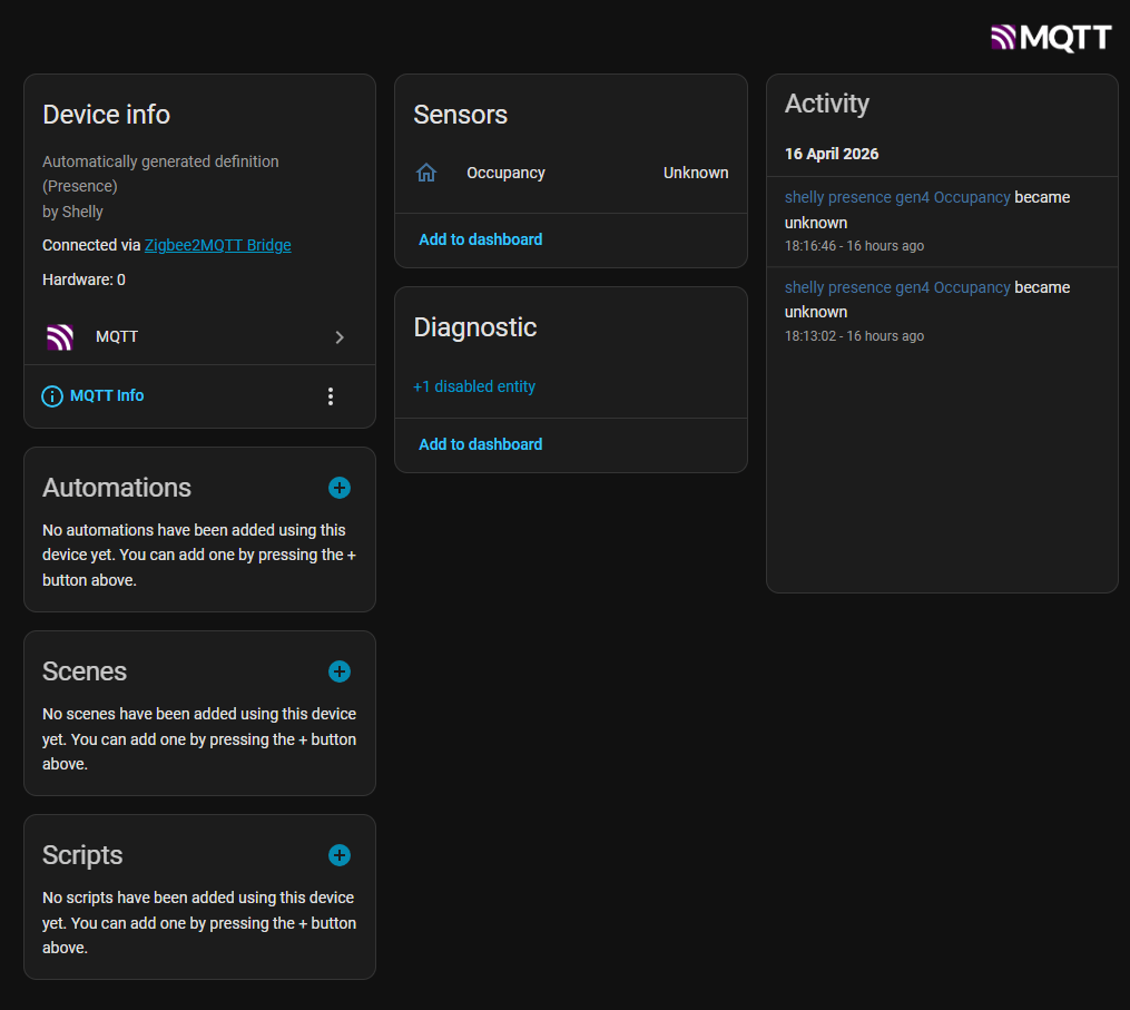 I’m a little concerned that at this point I went back to Home Assistant and Zigbee2MQTT and Presence shoed as NULL even though the sensor was clearly showing me (or a generic person, rather) present in the room in the Shelly app. (Zigbee) and in the second instance (APP) “unknown” – see image below. I’ve asked Shelly for clarification.