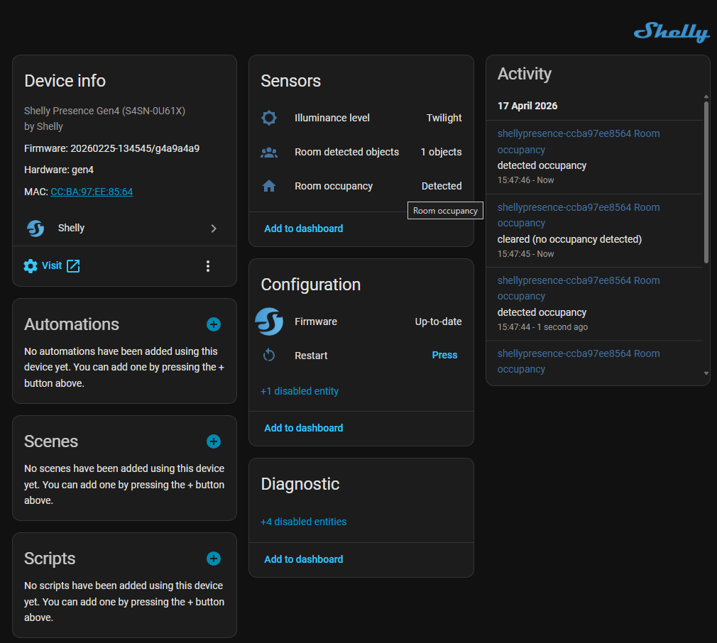 I went into the deep end and opened up Home Assistant to notice that Shelly Presence Gen4 was available and to see what entities were available for use. Up to now I can only see one unique entity, that’s presence true or false, there appear to be several identical entries.